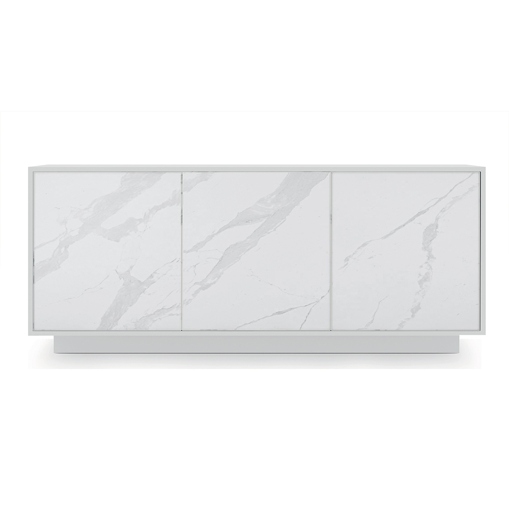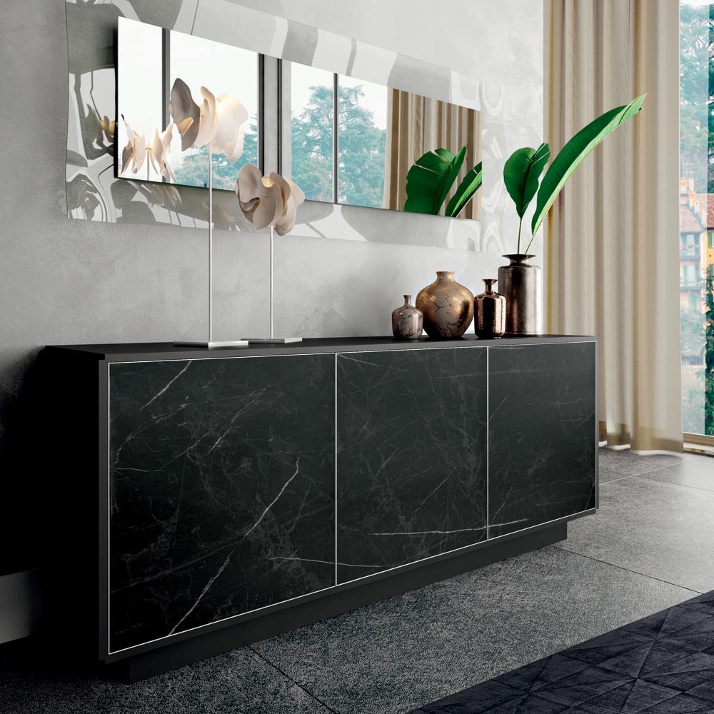 خزانة جانبية من الخشب المصقول مع أبواب من مادة HPL ذات تأثير الرخام، صنع في إيطاليا.
